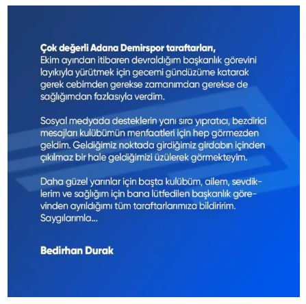 Adana Demirspor Başkanı Bedirhan Durak, Görevinden İstifa Etti