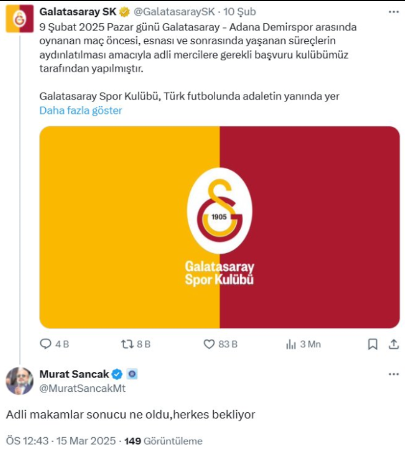Adana Demirspor Kulübü'nün sahibi Murat Sancak, Galatasaray Spor Kulübü'nün 10 Şubat 2025'te yaptığı açıklamalara yanıt verdi. Galatasaray, Adana Demirspor'a karşı verilen ceza kararı sonrasında adli mercilere başvurduklarını açıklamıştı. Bu açıklamanın ardından Murat Sancak, 15 Mart 2025'te sosyal medya hesabı üzerinden yaptığı bir paylaşımda, "Adli makamlar sonucu ne oldu, herkes bekliyor" ifadesini kullandı. Ancak Sancak kısa bir süre sonra yazdığı bu mesajı sildi.Galatasaray, 9 Şubat 2025'te oynadığı maçın ardından yaptığı açıklamada, maç öncesinde, sırasında ve sonrasında gelişen genişlerin aydınlatılması amacıyla adli mercilere başvurduklarını duyurmuştu. Sarı-kırmızılı kulüp, Türk futbolunda adaletin yanında yer almayı ve sahada en iyi şekilde mücadele etmeyi sürdüreceklerini belirterek, adli süreci takip edeceklerini ifade etti.Murat Sancak'ın, Galatasaray'ın bu açıklamasına verdiği yanıt ise futbol camiasında dikkat çekti. Sancak'ın yazdığı, ancak kısa bir süre içinde silindiği mesajı, kamuoyunda merakla takip edildi. Bu gelişme, iki kulüp arasındaki gerilimi bir kez daha gündeme taşıdı.