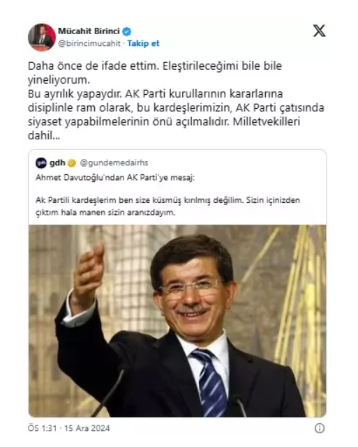 AK Partili Mücahit Birinci'den Ahmet Davutoğlu'na Siyaset Yapma Çağrısı: "AK Parti Çatısı Altında Yer Alabilmeli"