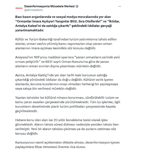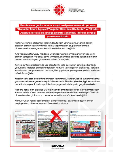 Antalya Kalesi’nin satışa çıkarıldığına dair bazı basın organlarında yer alan haberler kamuoyunda büyük tepki topladı. Sosyal medyada da gündem olan iddiaların ardından Cumhurbaşkanlığı İletişim Başkanlığı Dezenformasyonla Mücadele Merkezi konuyla ilgili açıklama yaptı ve iddiaları kesin bir dille yalanladı.İddialar Kamuoyunda Tepki YarattıSon günlerde bazı medya kuruluşlarında, antalya Kalesi’nin satışa çıkarıldığı ve yangınlarda zarar gören ormanlık alanların otellere tahsis edileceği yönünde haberler yayımlandı. Bu iddialar kamuoyunda infial yaratırken, tartışmalar sosyal medyada geniş yankı buldu.İletişim Başkanlığı’ndan Açıklamaİletişim Başkanlığı Dezenformasyonla Mücadele Merkezi, resmi sosyal medya hesabı üzerinden yaptığı açıklamada söz konusu iddiaların gerçeği yansıtmadığını duyurdu. Açıklamada şu ifadelere yer verildi:“Bazı basın organlarında ve sosyal medya mecralarında yer alan ‘Ormanlar İmara Açılıyor! Yangınlar Bitti, Sıra Otellerde!’ ve ‘İktidar, Antalya Kalesi’ni de satılığa çıkarttı’ şeklindeki iddialar doğru değildir. Kültür ve Turizm Bakanlığı tarafından turizm yatırımlarına tahsis edilen alanlar, orman vasfını yitirmiş kamu taşınmazlarıdır. Yanan orman alanlarının imara açılması kesinlikle söz konusu değildir. Anayasa’nın 169. maddesi uyarınca yanan ormanların yerine yeni orman yetiştirilir ve 6831 sayılı Orman Kanunu gereği bu alanların orman sınırları dışına çıkarılması mümkün değildir.”Tarihi Kale Burcu Satışta DeğilAçıklamada ayrıca Antalya Kaleiçi’nde yer alan tarihi kale burcunun satışa çıkarıldığı yönündeki iddiaların da doğru olmadığı vurgulandı. Kültürel varlık içeren bölgelerde, koruma kurullarının onayı olmadan herhangi bir yapılaşma veya satışın mümkün olmadığı belirtildi. Tahsislerin ise kültürel mirasın korunması, sürdürülebilir turizm anlayışı ve kamu yararı çerçevesinde yapıldığı ifade edildi.Yeniden Tahsis SüreciHabere konu olan alanın 20 yıldır konaklama tesisi olarak faaliyet gösterdiği kaydedilen açıklamada, alanın tahsis süresinin dolması nedeniyle yeniden tahsis ilanı verildiği bildirildi. Yetkililer, yeni bir alanın tahsise çıkarılmasının ya da surların satılmasının söz konusu olmadığının altını çizdi.Kamuoyuna ÇağrıAçıklamanın sonunda, vatandaşların yalnızca resmi açıklamaları dikkate alması gerektiği, dezenformasyon içeren haber ve paylaşımlara itibar edilmemesi gerektiği vurgulandı.