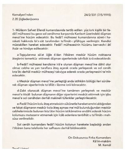 Çanakkale Savaşları’nın yaşandığı Tarihi Gelibolu Yarımadası’nda, 24-25 Nisan Çanakkale Kara Muharebeleri sırasında Mustafa Kemal Atatürk’ün Mayıs ayındaki muharebelerde Kanlısırt bölgesinin Türk tarafında kalması için Fedai Müfrezesine verdiği el yazısı emir ortaya çıkarıldı.