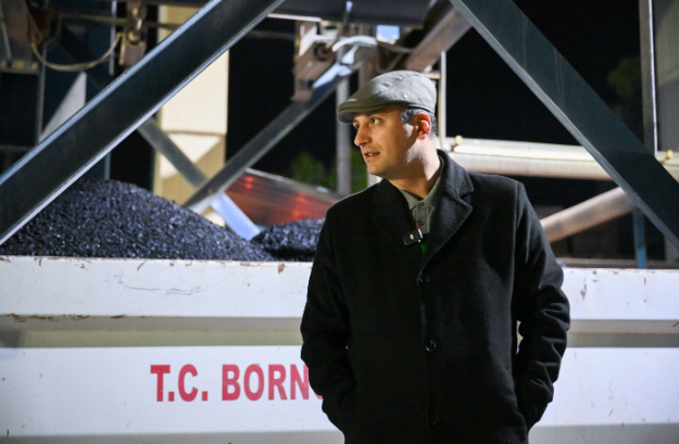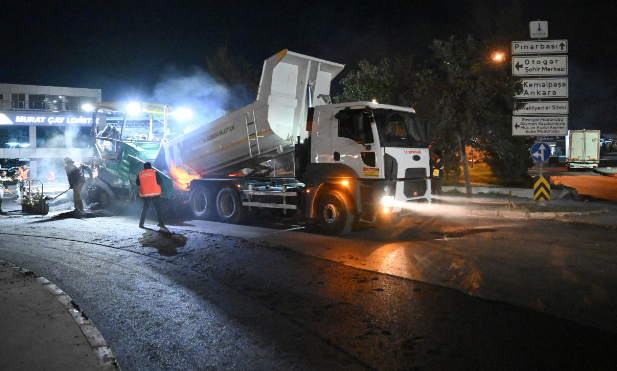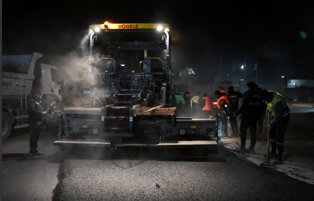 Bornova Belediye Başkanı Ömer Eşki, gece geç kalmayı sağlayan Işıkkent Kara Nakliyecileri Sitesi'nde devam eden asfalt serim devam etti.