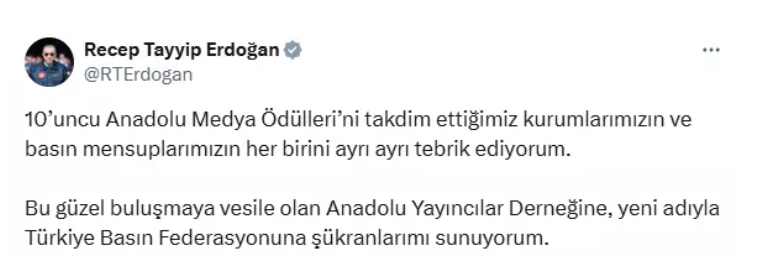Cumhurbaşkanı Recep Tayyip Erdoğan, Cumhurbaşkanlığı Külliyesi’nde düzenlenen “10. Anadolu Medya Ödülleri” programına katılarak ödül alan basın mensuplarını ve medya kuruluşlarını tebrik etti. Erdoğan, törende yaptığı konuşmada Türkiye Basın Federasyonuna teşekkürlerini ileterek, “Bu güzel buluşmaya vesile olan Anadolu Yayıncılar Derneğine, yeni adıyla Türkiye Basın Federasyonuna şükranlarımı sunuyorum” ifadelerini kullandı.Cumhurbaşkanı Erdoğan, törende yaptığı açıklamada, basın özgürlüğünün kötüye kullanılmasına karşı olduklarını belirterek, “Bizim itirazımız basın özgürlüğünün suistimal edilmesinedir” dedi. Geçmişte darbe bildirilerini aratmayan gazetelerin çıkarıldığını, vesayet odaklarına manşetlerden selam gönderildiğini ve antidemokratik çevrelere sözcülük yapıldığını hatırlatan Erdoğan, bu günlerin geride kaldığını vurguladı.10. Anadolu Medya Ödülleri Sahiplerini BulduCumhurbaşkanı Erdoğan’ın konuşmasının ardından 10. Anadolu Medya Ödülleri sahiplerini buldu. Törende çeşitli kategorilerde ödüller takdim edildi. Ödül kazananlar şöyle açıklandı:Jüri Özel Ödülü: TRT World adına Nizar SadawiYılın Televizyonu: CNN Türk adına Murat YancıYılın Dizisi: TRT 1 – Mehmet Fetihler SultanıYılın Ekonomi Yorumcusu: Ekonomist Muhammet BayramYılın Genel Yayın Yönetmeni: Yeni Şafak Gazetesi – Hüseyin LikoğluYılın Spor Hizmet Ödülü: BeinSports Spor Direktörü Raşid Said Al MariYılın Tarihi Yerel Gazetesi: Bartın Gazetesi – Esen AlişYılın Televizyon Programı: TRT 1 – Enine Boyuna; Nebi Miş, Murat Yeşiltaş, Muhittin Ataman, Gurbet Ece ZorbaYılın Kadın Haber Spikeri: NTV – Zehra KüçükdalakYılın Moderatörü: TV100 – Başak ŞengülYılın Çıkış Yapan Spor Kanalı: HT Spor – Ahmet Selim KulYılın Kültür Sanat Kanalı: Vav TV – Mecit OyarYılın Ankara Temsilcisi: NTV – Ahmet ErgenYılın Spor Programı: Haber Global – Kontra Programı, Nihat KahveciYılın Muhabiri: CNN Türk – Fulya ÖztürkYılın Yerel Televizyonu: TV Kayseri – Ömer HamurcuYılın Gazete Ankara Temsilcisi: Türkgün Gazetesi – Kadir YıldızYılın Köşe Yazarı: Türkiye Gazetesi – Yücel KoçYılın Erkek Haber Spikeri: TV24 – Kaan YakuphanYılın İnternet Haber Sitesi: akit.com.tr – Murat AlanYılın Yerel İnternet Sitesi: bilecikhaber.com.tr – Mücahit ErdalYılın Yerel Gazetesi: Ankara Ulus Gazetesi – Adem OrmanYılın Radyosu ve Radyo Programcısı: Radyo 7 – Talha Bora ÖgeYılın Yerel Radyosu: Adana Jest FM – Vedat GündoğanErdoğan’dan Türkiye Basın Federasyonuna Sosyal Medyada TeşekkürCumhurbaşkanı Erdoğan, ödül töreninin ardından sosyal medya hesabından yaptığı paylaşımda ödül alan basın mensuplarını ve medya kurumlarını bir kez daha tebrik ederek Türkiye Basın Federasyonuna teşekkür etti.Erdoğan paylaşımında, “10. Anadolu Medya Ödülleri’ni takdim ettiğimiz kurumlarımızın ve basın mensuplarımızın her birini ayrı ayrı tebrik ediyorum. Bu güzel buluşmaya vesile olan Anadolu Yayıncılar Derneğine, yeni adıyla Türkiye Basın Federasyonuna şükranlarımı sunuyorum” ifadelerine yer verdi.