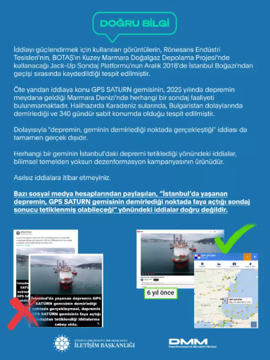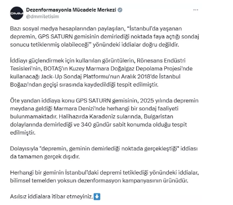 Cumhurbaşkanlığı İletişim Başkanlığı'na bağlı Dezenformasyonla Mücadele Merkezi (DMM), İstanbul'daki depremle ilgili olarak GPS SATURN gemisinin faaliyetiyle bağlantılı olduğu yönünde ortaya atılan iddiaları yalanladı ve gerçekleri kamuoyu ile paylaştı. DMM, sosyal medyada hızla yayılan "İstanbul'daki depremin, GPS SATURN gemisinin demirlediği noktada faya açtığı sondaj sonucu tetiklenmiş olabileceği" şeklindeki iddiaların asılsız olduğunu açıkladı.DMM tarafından yapılan açıklamada, söz konusu iddiaların doğru olmadığı vurgulandı. Ayrıca, bu iddiaların desteklemek için kullanılan görüntülerin, 2018 yılına ait bir olaya dayandığı belirtilerek, söz konusu görüntülerin İstanbul Boğazı'ndan geçen bir sondaj platformunun kaydı olduğuna dikkat çekildi. Bu platform, BOTAŞ’ın Kuzey Marmara Doğalgaz Depolama Projesi'nde kullanılacak Jack-Up Sondaj Platformu'ydu.DMM açıklamasında, GPS SATURN gemisinin 2025 yılında İstanbul’daki depremle ilişkilendirilemeyeceğini, çünkü geminin o dönemde Marmara Denizi’nde herhangi bir sondaj faaliyeti yürütmediğini belirtti. Ayrıca, geminin Karadeniz sularında, Bulgaristan kıyıları yakınlarında demirlemiş olduğu ve son 340 gündür sabit konumda bulunduğu tespit edilmiştir.Açıklamada, "depremin, geminin demirlediği noktada gerçekleştiği" iddiasının da tamamen gerçek dışı olduğu ifade edilerek, böyle asılsız iddialara itibar edilmemesi gerektiği vurgulandı. DMM, bu tür iddiaların bilimsel temelden yoksun bir dezenformasyon kampanyasının parçası olduğunu belirtti ve halkı bu tür yanıltıcı bilgiden uzak durmaya çağırdı.