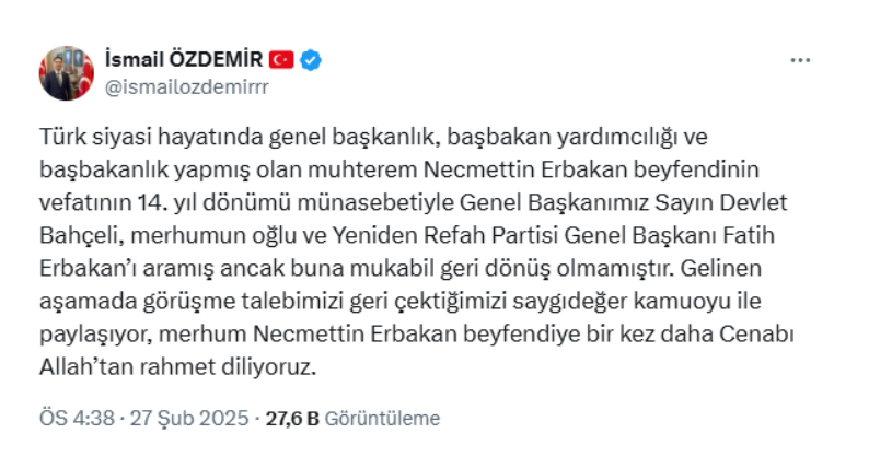 Milliyetçi Hareket Partisi (MHP) Genel Başkanı Devlet Bahçeli'nin, Saadet Partisi'nin kurucu lideri ve eski başbakanlardan merhum Necmettin Erbakan'ın vefatının 14. yıl dönümü nedeniyle Yeniden Refah Partisi Genel Başkanı Fatih Erbakan'ı telefonla aradığı, ancak yanıt alamamasının ardından MHP'nin görüşme talebini geri çektiği öne sürüldü. Konuya ilişkin MHP kanadından resmi bir açıklama gelirken, Fatih Erbakan da yaşananlara dair basın mensuplarına değerlendirmelerde bulundu.MHP’den Resmi AçıklamaMHP Genel Başkan Yardımcısı İsmail Özdemir, konuyla ilgili yazılı bir açıklama yaparak kamuoyunu bilgilendirdi. Açıklamada şu ifadelere yer verildi:"Genel Başkanımız Sayın Devlet Bahçeli, Türk siyasi tarihinde önemli görevler üstlenmiş olan merhum Necmettin Erbakan'ın vefat yıl dönümü vesilesiyle, oğlu ve Yeniden Refah Partisi Genel Başkanı Sayın Fatih Erbakan'ı telefonla aramıştır. Ancak kendisine herhangi bir dönüş sağlanmamıştır. Bu durum üzerine görüşme talebimizi geri çektiğimizi kamuoyuna saygıyla duyuruyoruz."Açıklamanın sonunda merhum Necmettin Erbakan'ın anısına saygı gösterilerek "Bir kez daha merhum Necmettin Erbakan beyefendiye Cenab-ı Allah'tan rahmet diliyoruz" ifadeleri kullanıldı.Fatih Erbakan: "Böyle Bir Tavrı Yadırgadık ve Üzüldük"Cumhuriyet Halk Partisi (CHP) Genel Başkanı Özgür Özel ile gerçekleştirdiği görüşmenin ardından gazetecilere açıklamalarda bulunan Fatih Erbakan, Bahçeli ile yaşanan telefon krizine ilişkin detaylar verdi. Erbakan, şu ifadeleri kullandı:*"Öncelikle biz, kendisinin ameliyat sonrası iyileşme sürecinde olduğunu bildiğimiz için yaklaşık 15 gün önce bir geçmiş olsun telefonu açmak istedik. Ancak bu süre içinde bize herhangi bir dönüş olmadı. Bu duruma bir anlam veremedik.Daha sonra, rahmetli Erbakan Hoca'mızın vefat yıl dönümü sebebiyle Sayın Bahçeli bizi aramış. O esnada biz MYK toplantımızı gerçekleştiriyorduk. Toplantıdan çıktığımızda bize bilgi verildi ve geri aramak istedik. Ancak ne olduysa bu iki saat içinde olmuş. Aramalarına hemen dönüş yapamamış olmamıza rağmen, görüşme talebinin geri çekildiğini öğrendik. Kimse kimseyi aradığında hemen hazır beklemek zorunda değildir. Böyle bir tavrı yadırgadık ve üzüldük."*Siyasette Yeni Bir Gerginlik mi?Yaşanan bu telefon krizinin, MHP ve Yeniden Refah Partisi arasındaki ilişkileri nasıl etkileyeceği merak konusu oldu. Siyasi kulislerde, bu olayın iki parti arasındaki görüş ayrılıklarının bir yansıması olup olmadığı tartışılmaya başlandı. Önümüzdeki günlerde taraflardan gelecek yeni açıklamalar, bu konuya dair daha net bir tablo çizilmesini sağlayabilir.