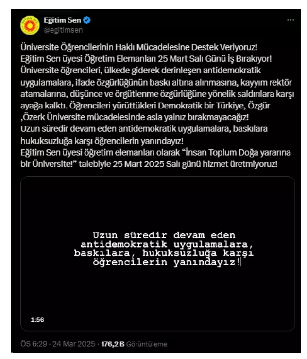 İstanbul Cumhuriyet Başsavcılığı, Eğitim ve Bilim Emekçileri Sendikası (Eğitim-Sen) Merkez Yürütme Kurulu üyeleri hakkında "suç işlemeye alenen tahrik" suçlamasıyla yeniden soruşturma başlatıldı.Başsavcılıktan yapılanmaya göre, 24 Mart 2025 tarihinde Eğitim-Sen'in resmi sosyal medya hesabı üzerinden yapılan bir paylaşımda, ülkelerde yaşanan toplumsal olaylarına kışkırtıcı ifadeler ortaya çıktı.Açıklamada, sendikanın, yasal grev şartlarına bakılmaksızın küresel çapta eyleme çağrıldığı, bu durumun hukuki açıdan değerlendirilmeye alındığı ifade edildi.Öte yandan Eğitim-Sen'in, üniversitelerin demokratik ve özgür bir üniversite talebiyle başlattıkları protestolara destek amacıyla 25 Mart 2025 Salı günü iş bırakma eyleminin yapılacağı duyurulmuştu.Bu çağrının, soruşturmanın yayılmasında etkili olduğu, organize olayın tüm ayrıntılarıyla incelendiği belirtildi.Soruşturma süreciyle ilgili gelişmelerin günlük günlerde netlik kazanması bekleniyor.