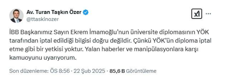 İstanbul Büyükşehir Belediye (İBB) Başkanı Ekrem İmamoğlu hakkında "resmi belgede sahtecilik" suçlamasıyla yeni bir soruşturma başlatıldı. İstanbul Cumhuriyet Başsavcılığı tarafından yürütülen soruşturma kapsamında, İmamoğlu'nun lisans diplomasının sahte olduğu iddiası araştırılıyor. Konuyla ilgili Yükseköğretim Kurulu (YÖK) tarafından hazırlanan bir raporun bulunduğu belirtilirken, İmamoğlu'nun 26 Şubat 2025 tarihinde ifade vermek üzere savcılığa çağrıldığı açıklandı.CHP'den Sert Tepki: "YÖK'ün Böyle Bir Yetkisi Yoktur"İddiaların ardından Cumhuriyet Halk Partisi'nden (CHP) sert bir açıklama geldi. CHP İstanbul Milletvekili Avukat Turan Taşkın Özer, sosyal medya hesabından yaptığı paylaşımda, YÖK'ün bir üniversite diplomasını iptal etme yetkisinin bulunmadığını belirterek şu ifadeleri kullandı:"İBB Başkanımız Sayın Ekrem İmamoğlu'nun üniversite diplomasının YÖK tarafından iptal edildiği bilgisi gerçeği yansıtmamaktadır. Çünkü YÖK'ün herhangi bir diplomayı iptal etme yetkisi yoktur. Kamuoyunun yalan haberler ve manipülasyonlara karşı dikkatli olmasını istiyoruz."Soruşturma Süreci ve YÖK RaporuBaşsavcılığın açıklamasına göre, Ekrem İmamoğlu’nun lisans diplomasının sahte olduğu yönünde yapılan ihbarlar üzerine soruşturma başlatıldı. Bu kapsamda YÖK tarafından bir rapor hazırlandı ve raporda, İmamoğlu'nun diplomasının sahte olduğuna ilişkin tespitlerin yer aldığı öne sürüldü. Savcılık, söz konusu rapor doğrultusunda Ekrem İmamoğlu’nu ifadeye çağırdı.İmamoğlu Cephesinden Açıklama BekleniyorYaşanan gelişmelerin ardından Ekrem İmamoğlu ve avukatlarının konu hakkında nasıl bir açıklama yapacağı merak konusu oldu. CHP kanadı, iddiaları tamamen reddederken, soruşturma sürecinin nasıl ilerleyeceği kamuoyu tarafından yakından takip ediliyor.İBB Başkanı Ekrem İmamoğlu’nun 26 Şubat 2025 tarihinde İstanbul Cumhuriyet Başsavcılığı’nda ifade vermesi bekleniyor.