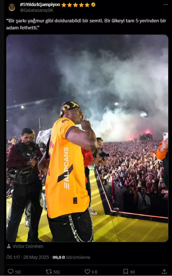 Galatasaray, Napoli’den bonservisini almak için yoğun çaba gösterdiği Victor osimhen ile ilgili yaptığı son paylaşım sosyal medyada büyük ilgi gördü. Sarı-kırmızılı kulüp, Osimhen’in şampiyonluk kutlamalarındaki fotoğrafını “Bir şarkı yağmur gibi doldurabildi bir semti. Bir ülkeyi tam 5 yerinden bir adam fethetti.” ifadeleriyle paylaştı.Yapılan bu paylaşım, sadece iki dakika içinde binlerce etkileşim alarak takipçilerden yoğun beğeni ve yorum yağmuruna tutuldu. Özellikle Osimhen’in performansı ve geleceğiyle ilgili tartışmaların sürdüğü bu dönemde, Galatasaray’ın bu paylaşımı taraftarlar arasında büyük heyecan yarattı.Öte yandan, Victor Osimhen’in Al Hilal takımıyla anlaştığı yönündeki haberler futbol gündeminde ses getirmeye devam ediyor. Ancak Galatasaray cephesi, Nijeryalı yıldızın bonservisini almak için çalışmalarını sürdürüyor. Sosyal medyada yapılan paylaşım, kulübün Osimhen’e verdiği değerin ve kararlılığının göstergesi olarak değerlendiriliyor.