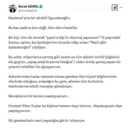 Gazeteci Murat Ağırel, sosyal medya hesabından yaptığı açıklamayı, kendisine ve ailesine yönelik ağır tehditlerin yapılacağını duyurdu. Ağırel, özellikle eşi ve 13 yaşındaki kızının hedef alındığını belirterek, kendisine gönderilen tehdit mesajlarını izleyenlerle paylaştı. Ağırel'in ifadesine göre, bir kişi, kendisi belirli bir kişiyle röportaj yapması durumunda, ailesinin kadın üyelerine yönelik cinsel saldırılarda bulunacağı ve onları “Narin gibi katledileceği” şeklindeki korkunç tehditlerde barındırıyordu.Ağırel, iletilerin paylaşılarak tehditlerin kaydedilmesi sağlanır. Sosyal medya platformunda yaptığı açıklamalarda, tehditlerin yalnızca kendisini değil, tüm ailesini hedef kitlesini vurgulayan Ağırel, tehditleri gönderen kişilerin kimliklerini ayırma ve aile dosyalarının özel olarak yasadışı ele geçiren bir çete olduğunu söyledi. Ayrıca, bu çetenin, yapay zekâyı kullanarak sahte cinsel içerikip, şantaj yaparak tehditle üretken aile üyelerine saldırıda bulunma tehdidinde bulunduğunu belirtti.Gazeteci Ağırel, "Bütün ailemin kimliğini almayı ele geçiren bu çete, şimdi de ailemin telefonlarına tehdit mesajları gönderiyor" şeklinde bir açıklama yaparak, durumun ciddiyetini vurguladı. Ayrıca, tehditlerin sadece kendisini hedef almadığını, tüm sınıfların de bu tehditlerin odak noktası olduğunu ifade etti.Ağırel, bu durumu ifşa ederek sadece kişisel bilgilerini değil, aynı zamanda gazetecilerin ve ailelerinin yaşadığı tehlikeleri gözlerine sermek istediğini belirtti. Tehditlerin ardından, Ağırel, Emniyet Siber Suçlar biriminden, tehditleri gönderen çetenin hızla bulunarak yargılama talep etti. Gazeteci, paylaşımın amacı olarak, tehditlerin ve şantajların kaydedilmesini ve yaşadığı tehdidi tüm kamuoyunun bilmesini istediğini söyledi.Ağırel'in açıklaması, gazetecilerin, özellikle kamuya açık isimlerin ve ailelerin, bu tür tehlikeli tehditlere karşı ne denli ölümler olduğunu bir kez daha gözler önüne serdi.