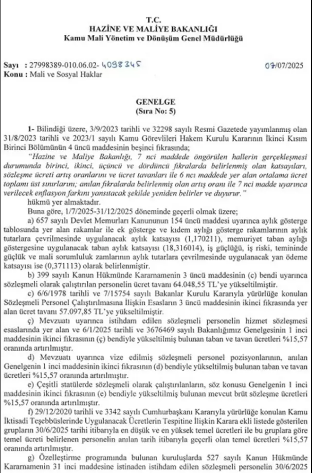 Hazine ve Maliye Bakanı Mehmet Şimşek, milyonlarca çalışanı ve emekliyi yakından ilgilendiren zam kararını resmi olarak imzaladı. Yapılan düzenleme ile sözleşmeli personel, memur ve memur emeklilerine yüzde 15,57 oranında zam yapılması kesinleşti.Genelgede ayrıca kıdem tazminatı tavanı ve bedelli askerlik ücretine ilişkin güncellemeler de yer aldı. Buna göre kıdem tazminatı tavanı 53 bin 919 lira 68 kuruş olarak belirlendi.Memurların maaşlarını etkileyen katsayılar da 657 sayılı Devlet Memurları Kanunu'nun 154. maddesi uyarınca güncellendi. Yeni katsayılar şu şekilde açıklandı:Aylık katsayı: 1,170211Taban aylık katsayısı: 18,316014Yan ödeme katsayısı: 0,371113Bu katsayılar, memurların ek gösterge, kıdem aylığı, iş güçlüğü ve risk tazminatları gibi farklı ödeme kalemlerine doğrudan yansıyacak.Ayrıca bedelli askerlik ücreti de kesinleşti ve 280 bin 850 lira 54 kuruş olarak açıklandı. Yoklama kaçağı ve bakaya durumundaki kişiler için uygulanacak bedelli askerlik bedeli ise 4 bin 95 lira 74 kuruş olarak belirlendi.Bu kararlar, memur maaşları, tazminatlar ve askerlik ücretlerinde güncelleme yapılmasını sağlayarak, ilgili kesimlerin gelirlerinde artışa yol açacak.