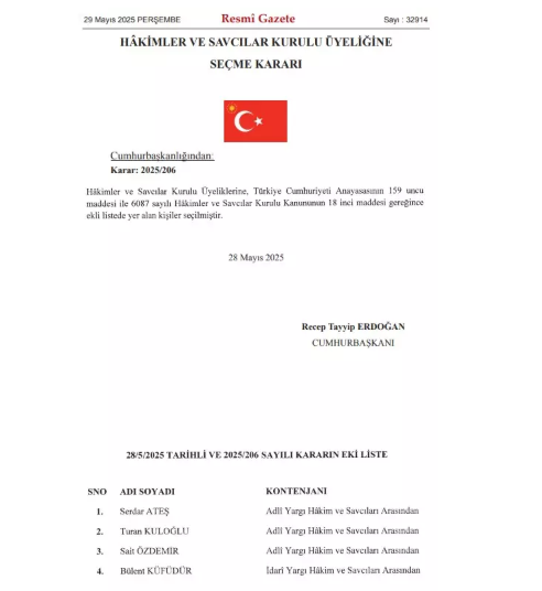 Açıklanan karara göre, Serdar Ateş, Turan Kuloğlu, Sait Özdemir ve Bülent Küfüdür HSK üyeliğine getirildi.