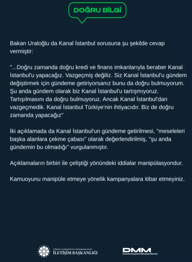 Cumhurbaşkanlığı İletişim Başkanlığı Dezenformasyonla Mücadele Merkezi (DMM), Çevre, Şehircilik ve İklim Değişikliği Bakanı Murat Kurum ile Ulaştırma ve Altyapı Bakanı Abdulkadir Uraloğlu'nun Kanal İstanbul Projesi ile ilgili yaptıkları açıklamaların çeliştiği yönündeki iddialara cevap verdi. İletişim Başkanlığı, iki bakanın açıklamalarının birbirini çelişmediğini ve kamuoyunun yanıltılmaması gerektiğini belirtti.Çevre, Şehircilik ve İklim Değişikliği Bakanı Murat Kurum, "Kanal İstanbul'la ilgili şu anda gündemimizde bir konu yok." şeklinde bir açıklama yapmıştı. Ancak, Ulaştırma ve Altyapı Bakanı Abdulkadir Uraloğlu, bir gün sonra, "Kanal İstanbul Projesi'nden vazgeçmedik. Bugün gündemimizde olmasa da doğru zaman geldiğinde projeyi mutlaka gerçekleştireceğiz." ifadelerini kullanarak, projenin hala yürürlükte olduğunu belirtti.İletişim Başkanlığı Dezenformasyonla Mücadele Merkezi, bu açıklamalar arasındaki farkların "çelişki" olarak değerlendirilmemesi gerektiğini duyurdu. Bakan Kurum'un açıklamalarında "Kanal İstanbul Projesi'nden vazgeçildi" şeklinde herhangi bir ifade yer almadığı vurgulandı. Bakan Kurum, mevcut gündemin bu proje etrafında şekillenmediğini ve konunun polemiklere neden olmaması gerektiğini ifade etmişti. Bu açıklamada, Kanal İstanbul Projesi'nin iptaline dair herhangi bir karar alınmadığı, yalnızca şu anda gündemde olmadığı belirtilmişti.Bakan Uraloğlu ise Kanal İstanbul'un hala Türkiye'nin ihtiyacı olduğunu, bu projeye olan inançlarının sürdüğünü ve doğru zamanda gerekli finansman sağlandığında projenin hayata geçirileceğini ifade etti. İletişim Başkanlığı, her iki bakanın da bu projeyi zamanlamaya bağlı olarak ele aldıklarını ve her iki açıklamanın da aynı doğrultuda olduğunu belirtti.DMM, bu açıklamalar arasındaki farklılıkların manipülasyona açık yorumlarla çelişki olarak sunulmasına karşı, kamuoyunun yanıltılmaması gerektiği konusunda uyarıda bulundu.