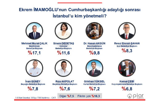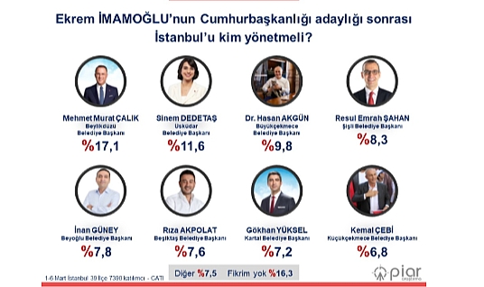 Ekrem İmamoğlu’nun Cumhurbaşkanlığı adaylığına karar vermesinin ardından, İstanbul Büyükşehir Belediye Başkanlığı koltuğuna kimin oturması gerektiği konusunda kamuoyunda büyük bir tartışma başladı. Bu kapsamda yapılan bir anketin sonuçları, İstanbulluların bu konudaki tercihlerini ortaya koydu.BİRİNCİ SIRADA SÜRPRİZ BİR İSİM: MURAT ÇALIKPiar Araştırma Şirketi tarafından 1-6 Mart tarihleri arasında gerçekleştirilen anket, İstanbul’un 39 ilçesinde yaşayan seçmenlerin katılımıyla yapıldı. Sonuçlara göre, İstanbulluların en çok tercih ettiği isim yüzde 17,1 oy oranıyla Beylikdüzü Belediye Başkanı Mehmet Murat Çalık oldu. Çalık’ın, İBB Başkanlığı için en fazla destek gören isim olması kamuoyunda büyük yankı uyandırdı.DİĞER ADAYLARIN OY DAĞILIMIAnkette, İstanbul’un yeni belediye başkanı olması yönünde öne çıkan diğer isimler ve aldıkları oy oranları şu şekilde sıralandı:Üsküdar Belediye Başkanı Sinem Dedetaş – %11,6Büyükçekmece Belediye Başkanı Dr. Hasan Akgün – %9,8Şişli Belediye Başkanı Resul Emrah Şahan – %8,3Beyoğlu Belediye Başkanı İnan Güney – %7,8Beşiktaş Belediye Başkanı Rıza Akpolat – %7,6Kartal Belediye Başkanı Gökhan Yüksel – %7,2Küçükçekmece Belediye Başkanı Kemal Çebi – %6,8Bu sonuçlar, İBB Başkanlığı için farklı ilçelerden çeşitli isimlerin aday olarak öne çıktığını gösterirken, kamuoyunun adaylar konusundaki görüş ayrılıklarını da gözler önüne serdi.İSTANBUL’DA SİYASİ GÜNDEMİN NABZI YÜKSELİYORAnket sonuçlarının açıklanmasının ardından, İstanbul’un yeni belediye başkanının kim olacağına dair tartışmalar daha da alevlendi. Siyaset kulislerinde, İBB Başkanlığı için öne çıkan isimlerin parti içindeki konumları ve İstanbul halkının tercihleri dikkatle değerlendirilmeye başlandı.Önümüzdeki süreçte, anketlerin ve siyasi gelişmelerin ışığında İstanbul’un yeni belediye başkanının kim olacağına dair daha net ipuçları ortaya çıkması bekleniyor. İstanbul’un yönetimini devralacak yeni başkanın kim olacağı, sadece İstanbul’u değil, Türkiye’nin siyasi geleceğini de etkileyebilecek önemli bir konu olarak gündemdeki yerini koruyor.