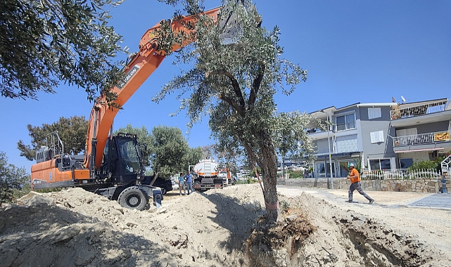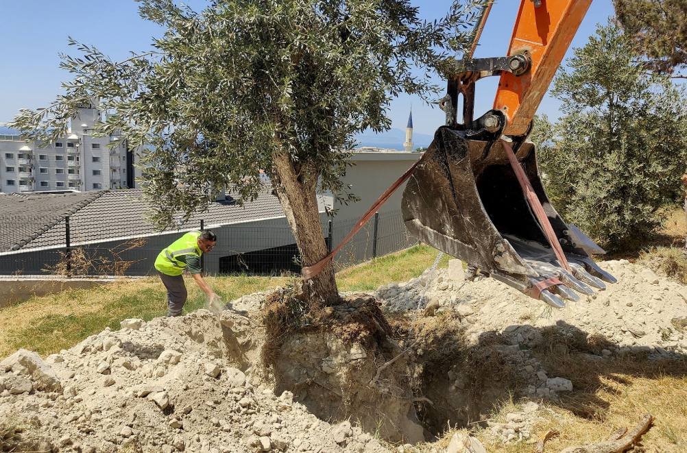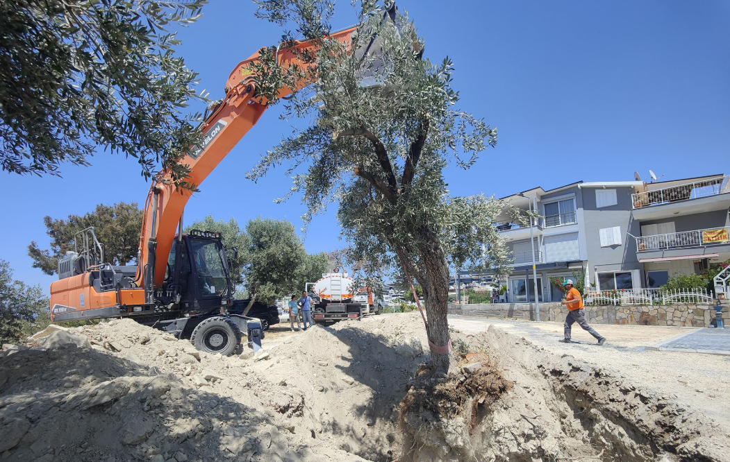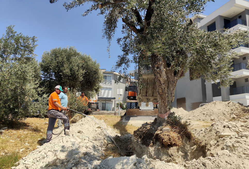 Kuşadası Belediyesi, kent genelinde yürütülen alt ve üstyapı çalışmaları sırasında kesilme riski bulunan ağaçları koruma altına alarak, farklı bölgelerdeki yeşil alanlara taşımayı sürdürüyor.