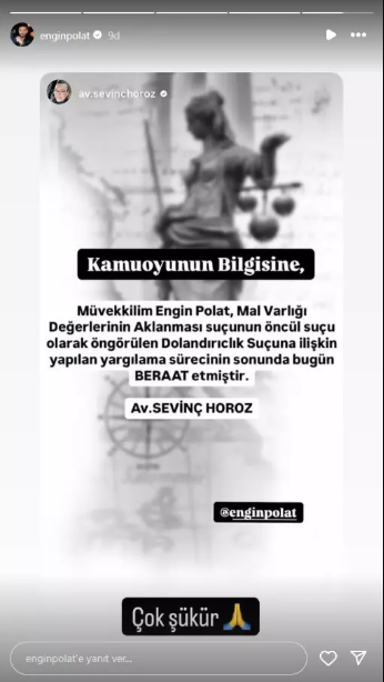Engin Polat’ın avukatı Sevinç Horoz, beraat kararının ardından yaptığı açıklamada, müvekkilinin uzun süredir kamuoyunda suçlu gibi gösterildiğini ve masumiyet karinesinin göz ardı edildiğini belirtti. Açıklamasında şu ifadelere yer verdi:"İstanbul Anadolu 54. Asliye Ceza Mahkemesi’nde görülen ‘Mal Varlığı Değerlerinin Aklanması’ davasında, öncül suç olarak değerlendirilen ‘Dolandırıcılık’ suçuna ilişkin yargılama tamamlanmış ve müvekkilimiz Engin Polat hakkında beraat kararı verilmiştir. Kamuoyunda uzun süredir müvekkilim hakkında masumiyet karinesi ihlal edilmiş, lekelenmeme hakkı göz ardı edilmiştir. Anayasa tarafından güvence altına alınan kişilik haklarının çiğnendiği bu süreçte, adaletin tecelli etmiş olmasından büyük memnuniyet duyuyoruz.”Engin ve Dilan Polat’tan İlk Açıklamalar