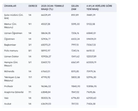 Türkiye İstatistik Kurumu (TÜİK) tarafından açıklanan son enflasyon verileri, memur, emekli ve memur emeklileri tarafından yakından takip edildi. Nisan ayı enflasyon rakamlarının belli olmasıyla birlikte, yılın ilk dört ayına ait enflasyon farkı da netleşti. Bu gelişmeyle birlikte, Temmuz ayında memur ve memur emeklilerine yapılacak muhtemel maaş zammı da şekillenmeye başladı.TÜİK verilerine göre, enflasyon Nisan ayında aylık bazda yüzde 3 artış gösterdi. Yıllık bazda ise enflasyon oranı yüzde 37,86 olarak kaydedildi. Açıklanan bu veriler doğrultusunda, Ocak, Şubat, Mart ve Nisan aylarını kapsayan ilk dört aylık dönemdeki enflasyon farkı ortaya çıktı. Buna göre memurlar, yüzde 12,29 oranında bir maaş zammı alacak.Memur ve memur emeklileri, 2025 yılı ilk 6 ayı için toplu sözleşme gereği yüzde 6 oranında zam alacak. Ancak enflasyonun bu oranın üzerinde gerçekleşmesi durumunda, oluşan fark maaşlara ekleniyor. İlk dört aylık verilere göre, toplu sözleşme zammını aşan enflasyon farkı yüzde 6,94 olarak hesaplandı. Böylece memurlar için şu ana kadar toplam zam oranı yüzde 12,29 oldu.Bu zam oranı, memurların mevcut maaşlarına doğrudan yansıtılacak. Temmuz ayında açıklanacak Mayıs ve Haziran ayı enflasyon verileri de eklenerek, kesin zam oranı belirlenecek. Bu süreçte öğretmen, polis, profesör ve diğer kamu çalışanlarının unvan ve derecelerine göre alacakları zamlı maaşlar da netleşmeye devam ediyor.Memur ve memur emeklileri, enflasyon farklarının maaşlarına yansıtılmasıyla birlikte Temmuz ayında hangi oranda bir gelir artışı elde edeceklerini merakla bekliyor. Temmuz ayında kesinleşecek verilerle birlikte, tüm memur ve emekli maaşları güncellenmiş olacak.
