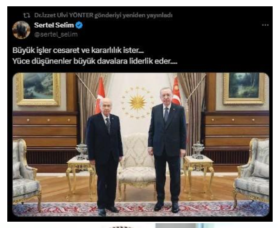 MHP Genel Başkan Yardımcısı İzzet Ulvi Yönter, terör örgütü PKK'nın lideri Abdullah Öcalan'ın silah bırakmanın ardından dikkat eden bir paylaşımda bulundu. Yönter, sosyal medya hesabından, Cumhurbaşkanı Recep Tayyip Erdoğan ile MHP Genel Başkanı Devlet Bahçeli'nin yer aldığı bir fotoğraf paylaştı. Yönter'in paylaşımında, "Büyük işler cesaret ve kararlılık ister" ifadesine de yer verildi.Öcalan'ın Çağrısı ve MHP'den Gelen TepkiÖcalan, İmralı Adası'ndan yaptığı açıklamada, PKK'nın silah bırakması ve kendisini feshetmesi gerektiğini belirterek, "Silah bırakma sayısında mevcutum ve bu çağrının yapılma tarihinde üstleniyorum. Devlet ve toplumla bütünleşmek için kongrenizi toplayın ve karar alın; tüm gruplar silah bırakmalı ve PKK kendini feshetmeli" dedi. Öcalan'ın bu büyüklüğü, Türkiye'deki Kürt meselesinin çözümüne yönelik bir adım olarak görüldü.MHP'nin Duruşu ve Liderlik VurgusuMHP Genel Başkan Yardımcısı İzzet Ulvi Yönter, Öcalan'ın topluluğa yönelik sosyal medya paylaşımında Cumhurbaşkanı Erdoğan ve MHP Genel Başkanı Bahçeli'nin yer aldığı bir fotoğraf paylaştı. Bu paylaşım, MHP'nin kararlı tutumunu ve güçlü egemenliğini simgeliyor. Yönter, fotoğrafının altına eklediği "Büyük işler cesaret ve kararlılık ister" mesajı ile partilerinin bu süreçte istikrarlı durmasını vurguladı.Sertel Selim'in Liderlik MesajıYönter'in paylaşımına, MHP İstanbul İl Başkanı Sertel Selim'in mesajlarının devamı geldi. Sertel Selim, sosyal medya hesabından paylaşım yaptığıda, “Yüce düşünenler büyük davalara liderlik eder” şeklinde bir mesaj kullanarak, MHP'nin yönetim anlayışını ve kararlılığını bir kez daha göze serdi.Bu paylaşımlar, Öcalan'ın silah bırakma kuvvetine karşı MHP'nin tavrını net bir şekilde ortaya koydu ve partinin bu konuda cesur bir duruş sergileyeceğini ortaya koydu.