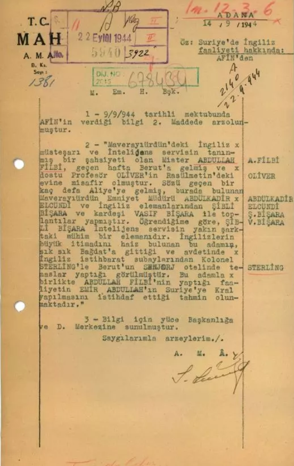 Milli İstihbarat Teşkilatı (MİT), 14 Eylül 1944 tarihli tarihi bir istihbarat raporunu resmi web sitesinde paylaştı. Bu rapor, İngiltere'nin Osmanlı İmparatorluğu'nun sona ermesinin ardından Orta Doğu'daki etkinliğini sürdürmek amacıyla yürüttüğü faaliyetleri ve bölgeye ilişkin planlarını gözler önüne seriyor. Rapor, özellikle İngiliz istihbaratçısı John Philby'nin, Ürdün Emiri Abdullah'ın Suriye'ye kral yapılması için yürüttüğü çalışmalarla dikkat çekiyor.İngiltere'nin Orta Doğu’daki Faaliyetleri