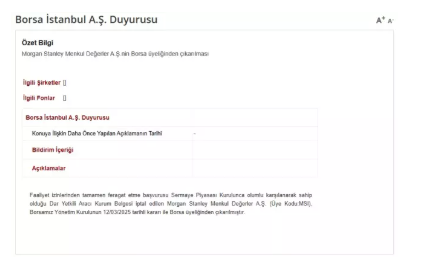 ABD merkezli dev yatırım bankası Morgan Stanley, kendi talebi doğrultusunda Borsa İstanbul üyeliğinden ayrıldı.