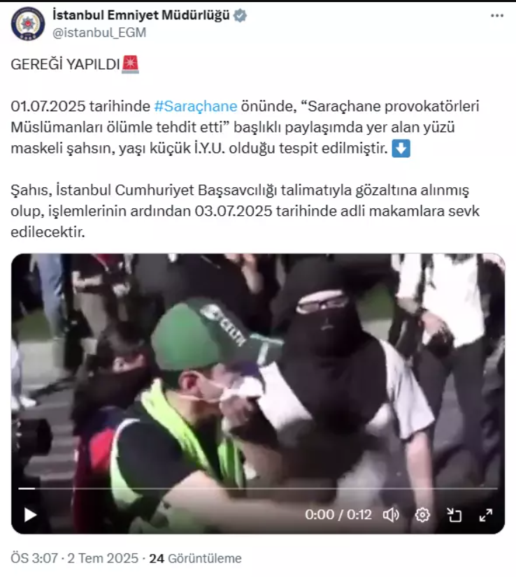 Yolsuzluk soruşturması kapsamında tutuklu yargılanan Ekrem İmamoğlu lehine saraçhane Meydanı’nda toplananlar arasında yer alan ve “Hepiniz bir bir asılacaksınız” sözleriyle Müslümanları idamla tehdit eden provokatör yakalandı. Yaşı küçük olan şüpheli İ.Y.U., adli mercilere sevk edilmek üzere gözaltına alındı.Saraçhane Meydanı’nda gerçekleştirilen eylem sırasında yaşanan provokatif tehditler, sosyal medya platformlarında “Saraçhane provokatörleri Müslümanları ölümle tehdit etti” başlığıyla geniş yankı buldu. Bu paylaşımların ardından İstanbul Emniyet Müdürlüğü, söz konusu şüphelinin kimliğini tespit etti.Emniyet yetkililerinin açıklamasına göre, yüzü maskeli ve yaşı küçük olan İ.Y.U., 1 Temmuz 2025 tarihinde gözaltına alındı. İşlemlerinin tamamlanmasının ardından ise 3 Temmuz 2025 tarihinde adli makamlara sevk edilmesi planlanıyor.İstanbul Emniyet Müdürlüğü tarafından yapılan resmi açıklamada, “01.07.2025 tarihinde Saraçhane önünde, ‘Saraçhane provokatörleri Müslümanları ölümle tehdit etti’ başlıklı paylaşımda yer alan yüzü maskeli şahsın, yaşı küçük İ.Y.U. olduğu tespit edilmiştir. Şahıs, İstanbul Cumhuriyet Başsavcılığı talimatıyla gözaltına alınmış olup, işlemlerinin ardından 03.07.2025 tarihinde adli makamlara sevk edilecektir.” ifadelerine yer verildi.Yaşanan bu gelişmenin ardından Saraçhane’deki provokatif tehditler hakkında yasal sürecin başlayacağı bildirildi.