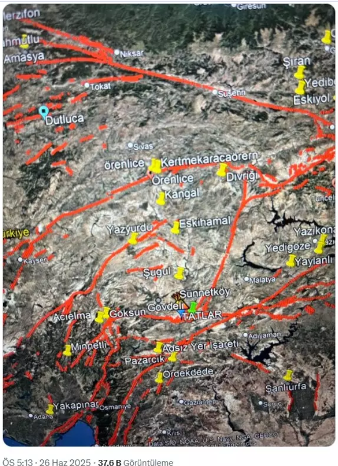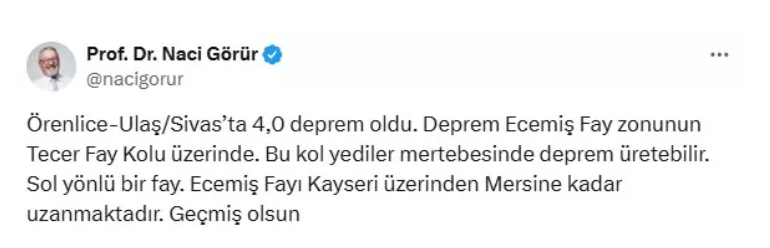Sivas’ın Ulaş ilçesinde saat 16.34’te meydana gelen 3,9 büyüklüğündeki deprem, çevre illerden de hissedildi ve kısa süreli panik yaşanmasına neden oldu. Afet ve Acil Durum Yönetimi Başkanlığı (AFAD), depremin yerin yaklaşık 7,7 kilometre derinliğinde gerçekleştiğini açıkladı.Bu gelişmenin ardından yer bilimci Prof. Dr. Naci Görür, sosyal medya üzerinden yaptığı açıklamayla bölgedeki deprem riskine dikkat çekti. Görür, Kayseri’den başlayıp Mersin’e kadar uzanan Ecemiş Fay Zonu’na bağlı Tecer Fay Kolu üzerinde yaşanan depremin, yediler mertebesinde, yani 7 büyüklüğüne kadar deprem üretebileceğini belirtti.Görür, paylaşımında şu ifadelere yer verdi: “Örenlice-Ulaş/Sivas’ta 4 büyüklüğünde bir deprem meydana geldi. Bu deprem, Ecemiş Fay Zonu’nun Tecer Fay Kolu üzerinde gerçekleşti. Söz konusu fay kolu, sol yönlü hareket eden ve yediler mertebesinde deprem üretebilen bir yapıya sahiptir. Ecemiş Fayı Kayseri’den başlayarak Mersin’e kadar uzanmaktadır. Bölge halkına geçmiş olsun dileklerimi iletiyorum.”Bu açıklama, bölgede deprem açısından dikkatli olunması gerektiğini hatırlatırken, özellikle Kayseri ile Mersin arasındaki fay hattının yakın takibe alınmasının önemini ortaya koydu.