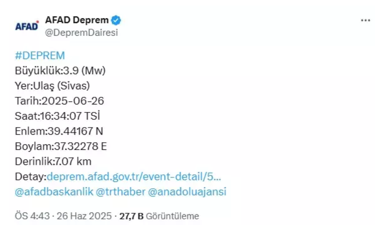 Sivas’ın Ulaş ilçesinde saat 16.34’te meydana gelen 3,9 büyüklüğündeki deprem, çevre illerden de hissedildi ve kısa süreli panik yaşanmasına neden oldu.