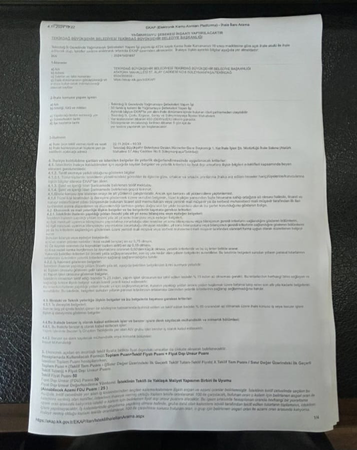 Tekirdağ Büyükşehir Belediyesi Destek Hizmetleri Daire Başkanlığı, kentteki altyapı iyileştirme amacıyla yağmur suyu sağlamak için yeni bir ihale başlattı. Ancak ihale şartnamesindeki bazı ayrıntılar, kamuoyunda şaşkınlık yarattı ve tartışmalara neden oldu.Spesifik Belge Şartı Dikkat Çekti