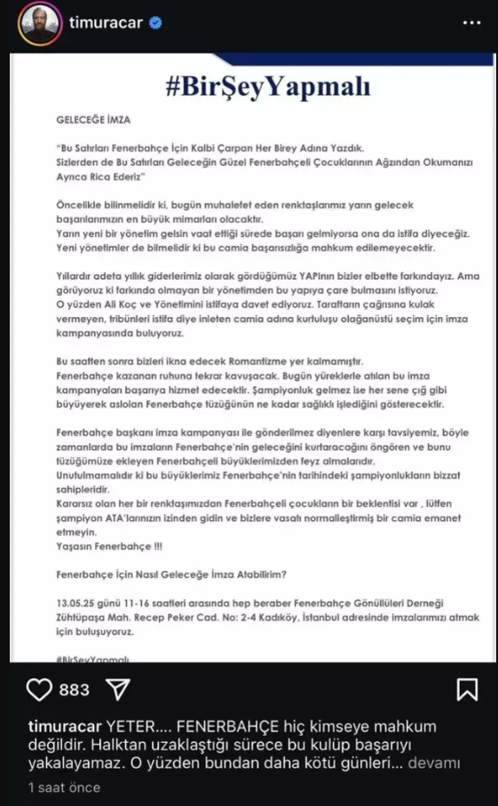 Ünlü oyuncu Timur Acar, Süper Lig'de şampiyonluk umutlarını mucizelere bırakan Fenerbahçe'nin son dönemlerdeki başarısız performansı nedeniyle yönetimi eleştiren sert bir açıklamada bulundu.