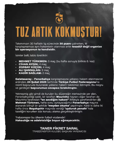 Trabzonspor Başkan Yardımcısı Taner Fikret Saral, 6 Nisan Pazar günü oynanacak Fenerbahçe maçı için hakem Mehmet Türkmen'in atanmasını sert bir şekilde eleştirdi.